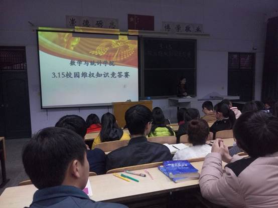 2016年3月13日星期日晚上六点,数学与统计学院在B合十三举行3.15消费者权益竞答赛,团总支书记沈会焘、杜娟辅导员以及主席团成员受邀作为嘉宾,为参赛者打分,目的在于进一步普及老员工消费权益知识,增强法律意识,让他们了解到消费利益在受到侵害的时候可以运用法律武器捍卫自身权益。